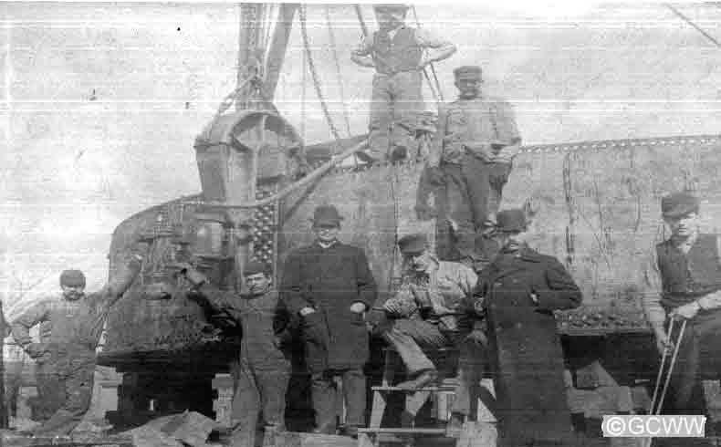 Boom slung horseshoe yoke used to install the sheet steel while the traveling frame completed most of the riveting